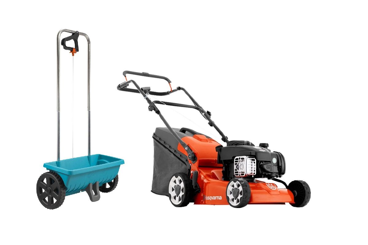 В состав набора входят: Газонокосилка бензо HUSQVARNA LC 140 (9676367-01) B&S 450e 40cм сбор в травосборник 50л выброс наза, Разбрасыватель GARDENA 00432-20.000.00 сеялка l