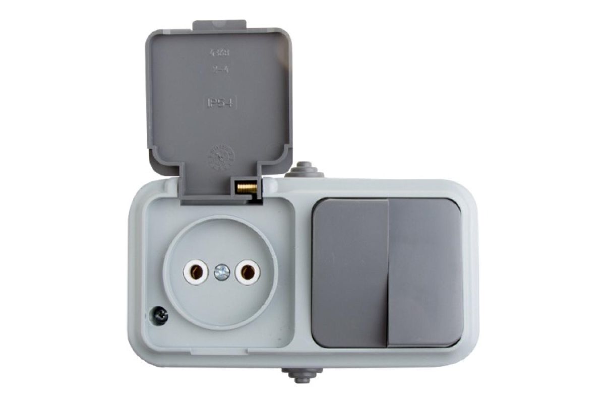 Выключатель двухклавишный + розетка влагозащищенная для открытой установки.